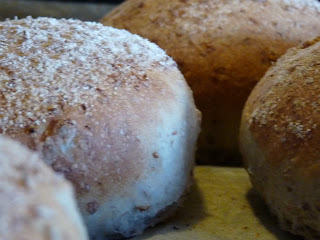Så jag satte en enkel deg, som jag först lät ligga i 1,5 timme, sedan bakade ut till frallor (på ca 90 gram styck), rullade i dinkelmjöl och täckte plåten med plast, stoppade in i kylskåpet och lät stå över natten.