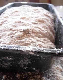 Dela sedan upp degen i två avlånga formar. Jag brukar antingen klä formarna med bakplåtspapper (speciellt bra för plåtformar eller väldigt slitna teflonformar) eller smöra dem och sedan mjöla dem med grovt rågmjöl.