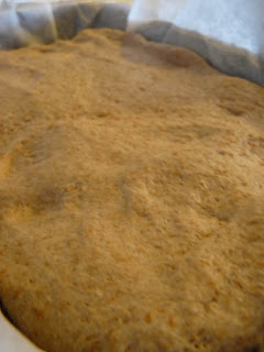 Jag la den i en form klädd med bakplåtspapper och lät den jäsa något över kanten, ca 1 timme.