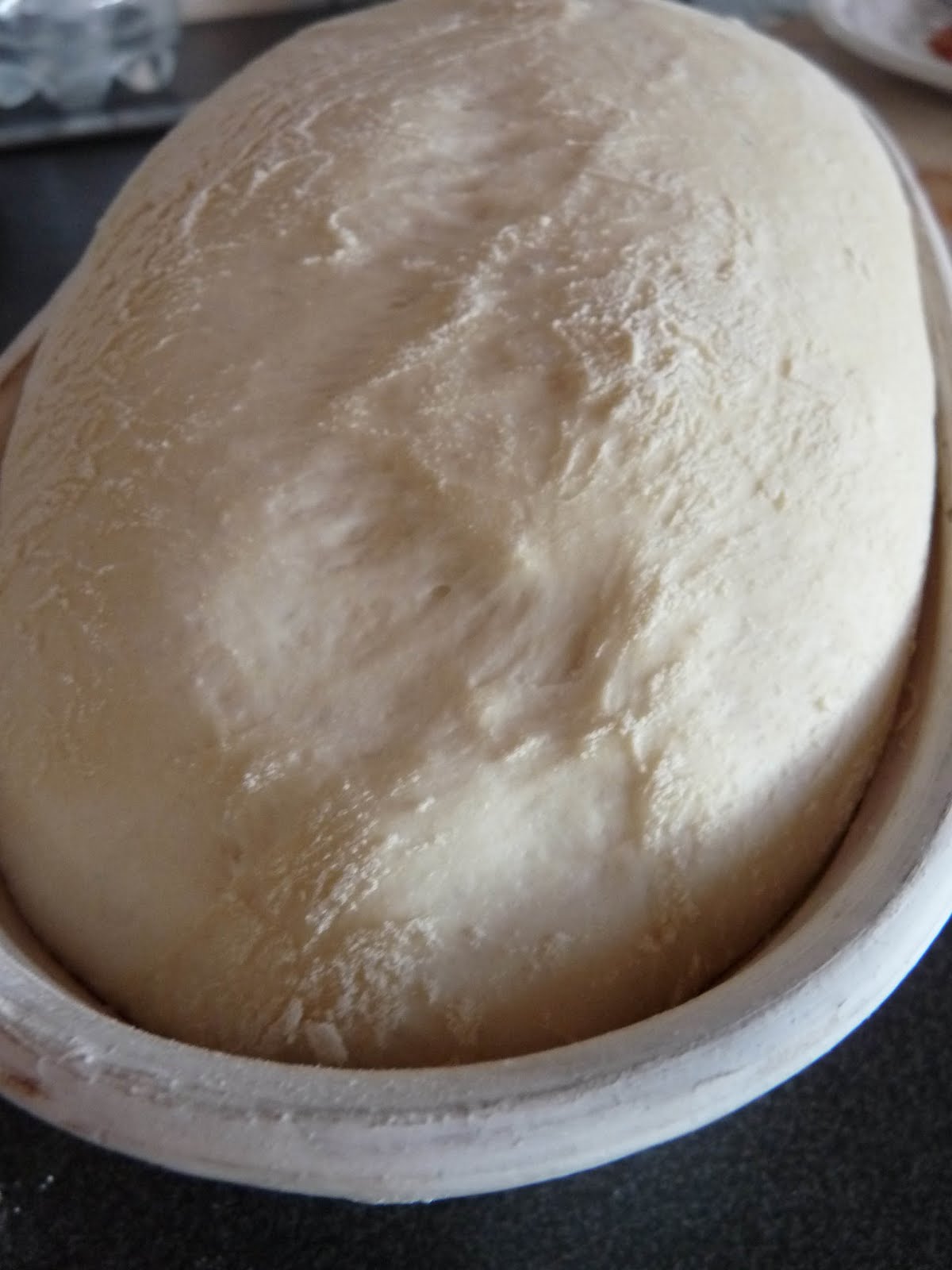 Jag vek en limpa av hela degen, det blir en ganska stor limpa, och la den i en jäskorg. Degen är såpass lös ändå, att den kommer bli ganska platt annars, och kan behöva lite stöd av en form.